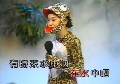 邊唱邊跳客家歌謠,你看的出來,這個拿麥克風的主唱,是誰嗎?對比五官,再看近一點,原來她就是甜心教主,王心凌。國小時候的作品,不但有假山,加上乾冰,營造池塘氛圍,還特製,豹紋蛤蟆裝,加上塑膠荷葉助陣,舞步也很fashion。