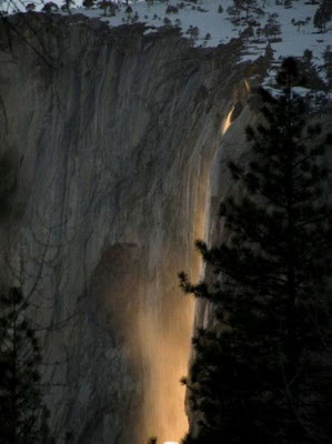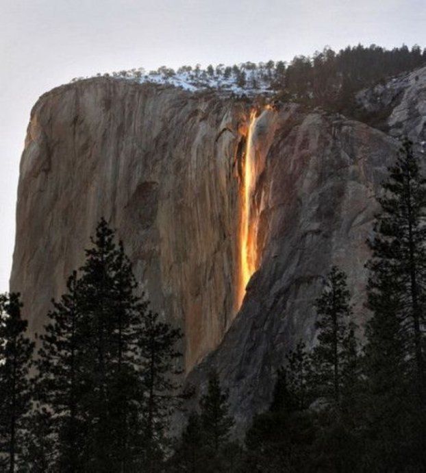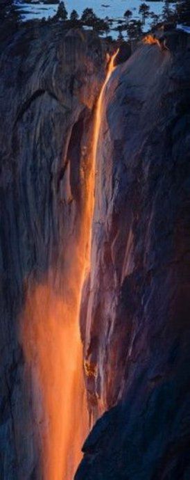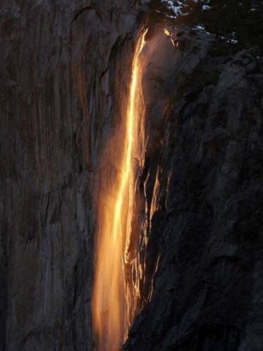 約塞米蒂國家公園 (Yosemite National Park)位于美國加利福尼亞州。這家建成于1890年的國家公園以峽谷、瀑布、千年美洲松聞名于世,佔地1200平方英裏。而酋長岩(El Capitan)上的火瀑布就是公園內最罕見的景觀之一。其實火瀑布並非火山爆發的岩漿飛流直下,也不是山頂有人在焊接往樓下撒火星。它是特定角度的陽光照射在瀑布上形成的光學效果。這一景觀只在每年2月末的兩個星期內有一定幾率可以看見。之所以這麼難以看到這種景象,關鍵在于火瀑布的出現需要滿足幾個條件。首先是瀑布的形成。這個瀑布是依靠酋長岩上的雪山融水為源的,所以並非一年四季都存在,酋長岩上的雪一般在每年的十二月和一月融化。到二月底的時候,這個瀑布很可能已經水盡瀑亡了。其次是太陽的角度。太陽的位置必須正好將光芒覆蓋在這個瀑布上。而合適的太陽角度只出現在每年一月、二月的晴天的傍晚,所以這些圖片值得欣賞和珍藏。