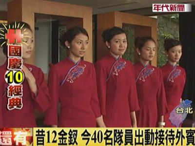銘傳大學連續25年擔任國慶大會的禮儀接待(國慶美女),10日將穿著紅色滾藍邊的改良式旗袍,引導中外貴賓入座並提供相關諮詢,今年遴選標準包括身材、面貌、儀態、語言能力及親和力等,40位美女清一色身材修長、穩重端莊,同時儀態大方、反應機智。指導老師張秋香表示,這40名服務學生(國慶美女)身高多集中在160至170公分之間,體重平均50公斤;在「外籍貴賓」區選擇應用英語系或英語進階班學生擔任接待。
