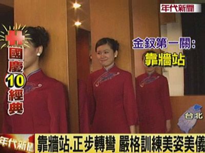 十二金釵歷史悠久,挑美貌、身材更重儀態,首先是靠牆站,接著正步轉彎90度,嚴格訓練要求美姿美儀,苦練力求優雅表現,但是正式上場狀況多,例如「一號」對座的笑話。(相關新聞見:40位美女清一色身材修長、穩重端莊,同時儀態大方、反應機智。)