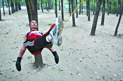 根 據大陸媒體報導指出,他苦練這項神功己經25年,但這功夫並不好練。他指著自己的尾椎說,「有一次,我從3公尺高的繩子上掉下來,把尾椎都摔彎了。」他也 說,他是在12歲時,遇到一位師傅指點,但當時未能掌握技巧,並沒有學成,後來完全是靠自己不斷苦練,才練出躺繩功力。