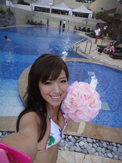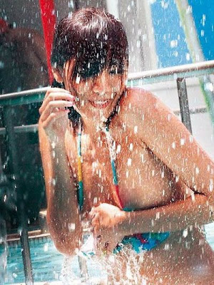 之前最紅的消息默過於某週刊登出來的貴妃出浴圖吧!在台北市內湖游泳池旁邊〝玩耍〞的她,被水柱衝下比基尼,使得傲人雙峰有如蛟龍吐火球般外露……提神的咖啡色B————-(消音)就這樣露了出來!