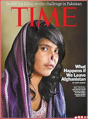 最新的時代雜誌封面(時代封面 割鼻女孩),一個女孩,有著清澈的雙眼,但清秀的臉孔中間,卻赫然出現一個大洞。攝影師裘蒂:「她說塔利班法庭為了懲罰她、詛咒她,割掉了她的雙耳以及鼻子。」
