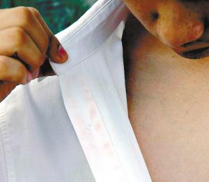 剛 開始,小黃還以為是將衣服混在一起洗,造成了脫色,所以才染上紅顏色。此後,小黃每次換下貼身白襯衫,都會特意單獨清洗,但仍然無濟於事,無論是哪件新衣 服,只要他貼身穿了一段時間,都會染上紅印,十分明顯。更讓小黃感到奇怪的是,衣服染上紅印後,無論如何費力清洗,紅印都沒有辦法洗乾淨,甚至連漂白粉也 無法漂去衣服上的紅漬。