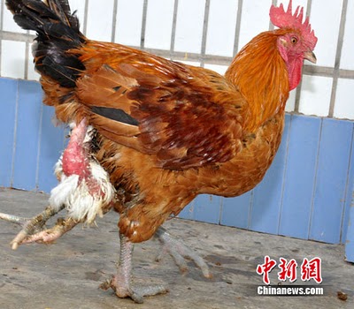 大陸重慶市雲陽縣棲霞鎮古城村一戶人家,養子一隻奇特的公雞(外星來的公雞),長了兩個肛門、三條腿、四隻腳。
