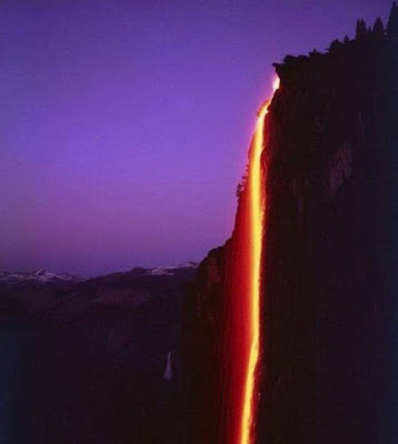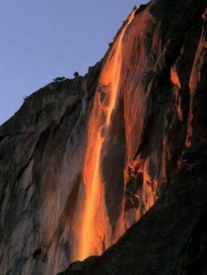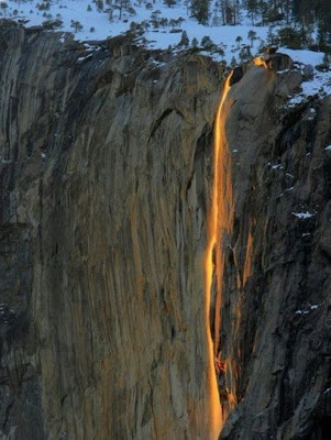 約塞米蒂國家公園 (Yosemite National Park)位于美國加利福尼亞州。這家建成于1890年的國家公園以峽谷、瀑布、千年美洲松聞名于世,佔地1200平方英裏。而酋長岩(El Capitan)上的火瀑布就是公園內最罕見的景觀之一。其實火瀑布並非火山爆發的岩漿飛流直下,也不是山頂有人在焊接往樓下撒火星。它是特定角度的陽光照射在瀑布上形成的光學效果。這一景觀只在每年2月末的兩個星期內有一定幾率可以看見。之所以這麼難以看到這種景象,關鍵在于火瀑布的出現需要滿足幾個條件。首先是瀑布的形成。這個瀑布是依靠酋長岩上的雪山融水為源的,所以並非一年四季都存在,酋長岩上的雪一般在每年的十二月和一月融化。到二月底的時候,這個瀑布很可能已經水盡瀑亡了。其次是太陽的角度。太陽的位置必須正好將光芒覆蓋在這個瀑布上。而合適的太陽角度只出現在每年一月、二月的晴天的傍晚,所以這些圖片值得欣賞和珍藏。